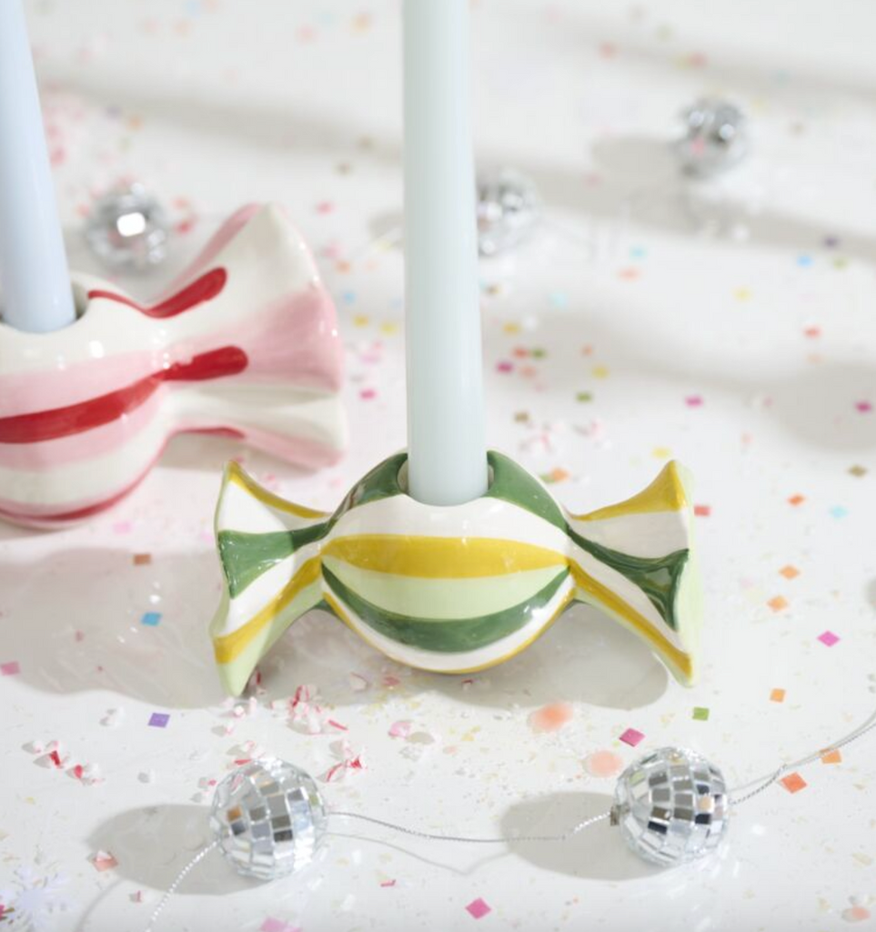 Treat your holiday decor to the delicious looking Bonbon Candleholder, a cheerful and bright candy shaped taper holder. This ceramic decorative candleholder has a rounded center and pinched ends that look like a real wrapped candy.