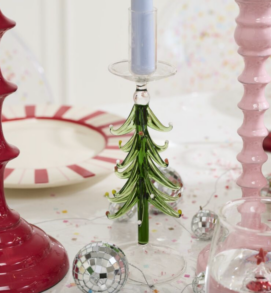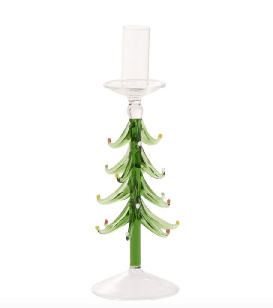 Capture the beauty and whimsy of the holidays with the Fir Tree Candleholder, a hand-crafted borosilicate glass taper holder with green branches and multicolor ornaments for a stem. A clear, circular base supports this tiny tree, and a clear cylinder opening with a wax catching plate sits on top. Available in 2 heights, each unique piece can be styled along a holiday table to create a dreamy decorative forest topped with a warm winter glow.