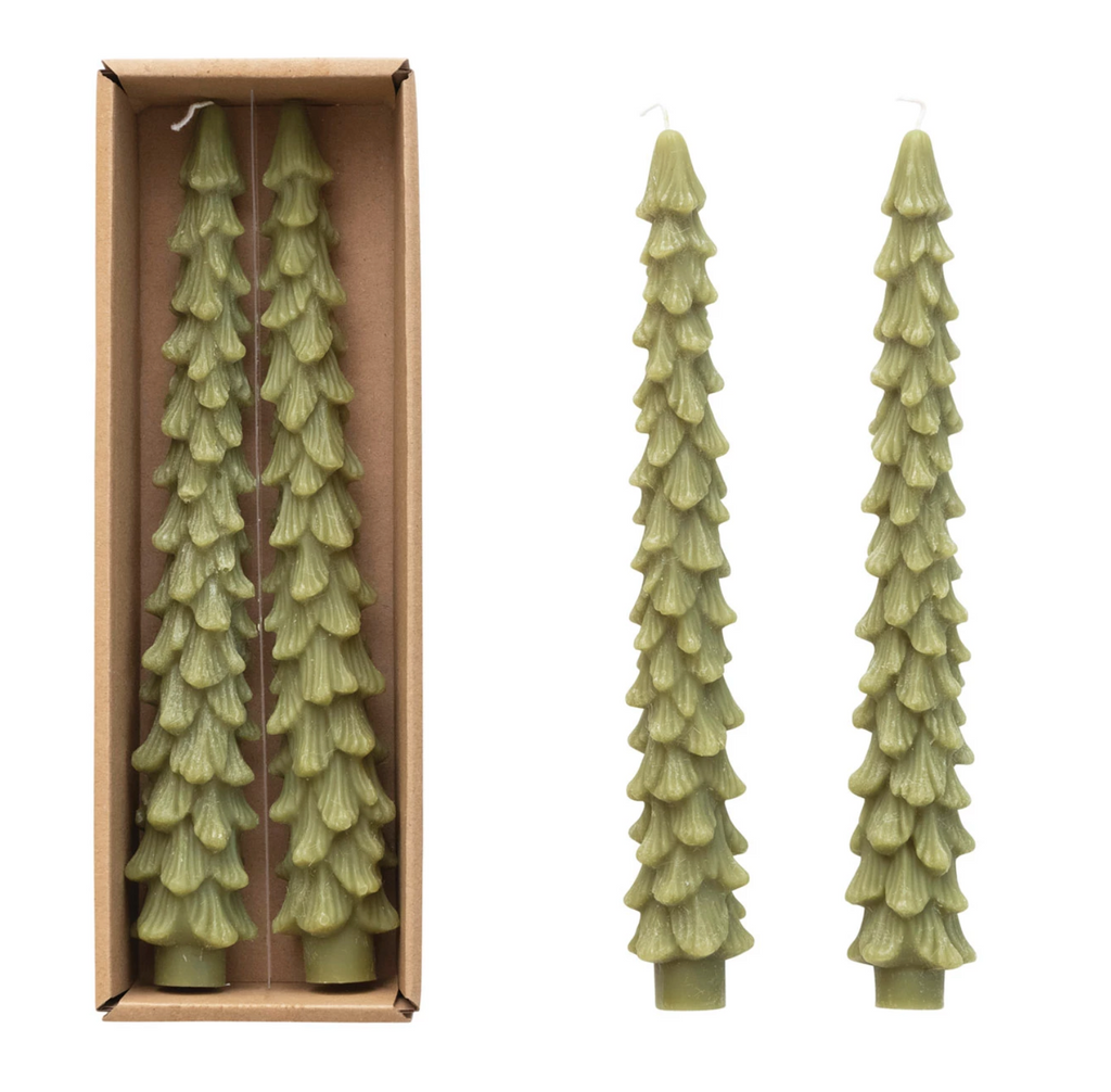Tree shaped taper candles made from unscented paraffin wax. Set of 2.
