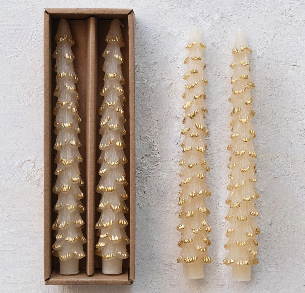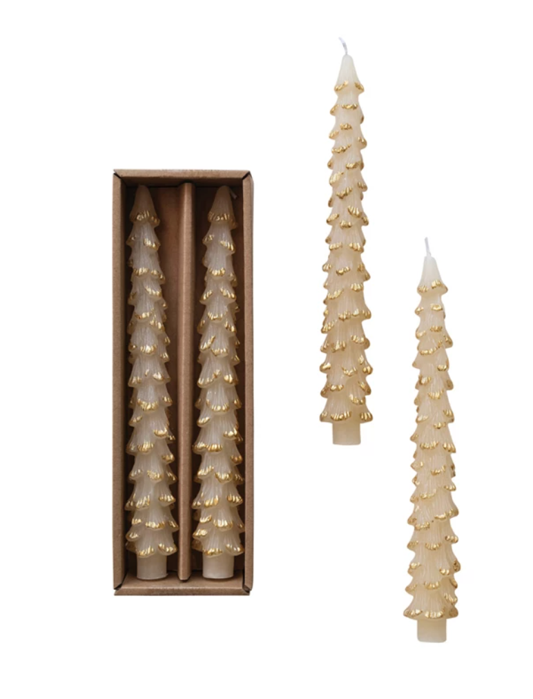 Tree shaped taper candles made from unscented paraffin wax. Set of 2.