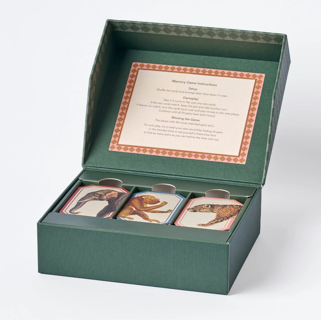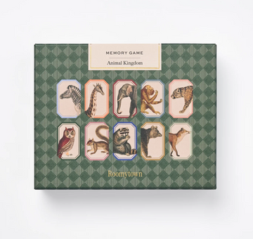 This Animal Kingdom Memory Game includes 24 pairs of shaped cards featuring incredible vintage illustrations of animals of the natural world compiled from antique books. Roomytown's design team in Bath, UK, have carefully adapted and enhanced the original artwork and applied it to each of the playing cards to create this elegant matching game that tests your memory skills.