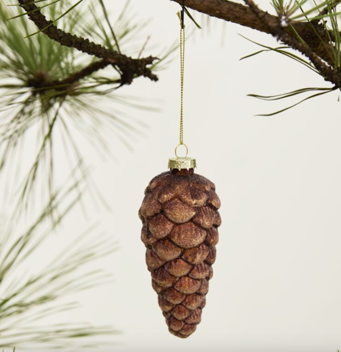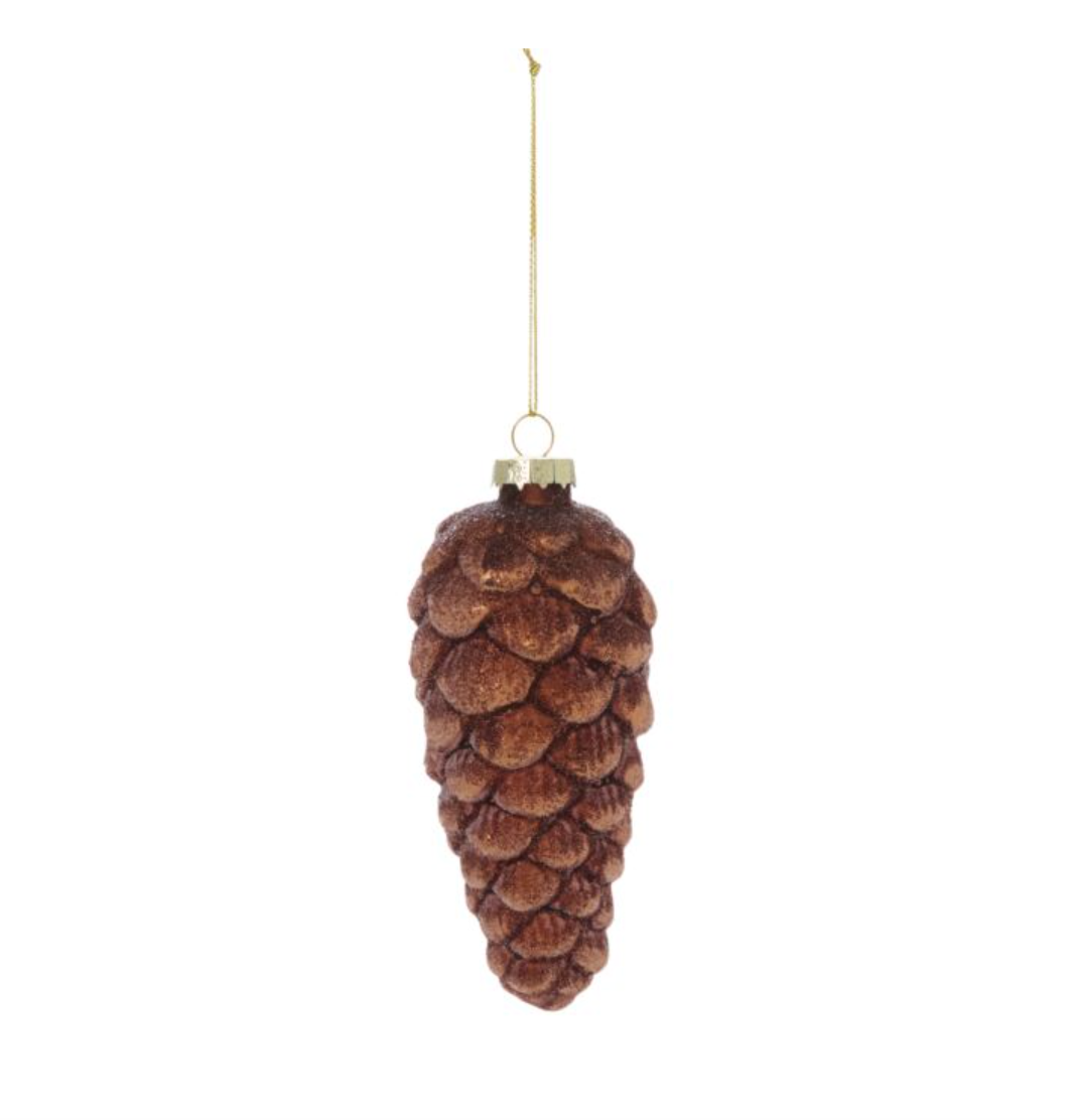 Decorate the Christmas tree with the bronze Frosted Pinecone Ornament, a nature inspired sparkling pinecone available in two sizes. A textured, shiny glass base is dusted in color coordinating glitter. These elegant pinecones are perfect on the tree or styled as bowl fillers as festive tabletop decor.