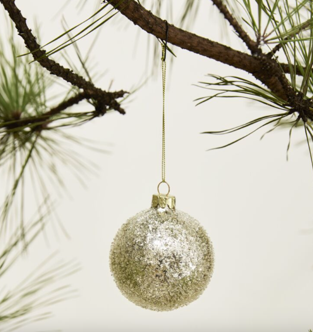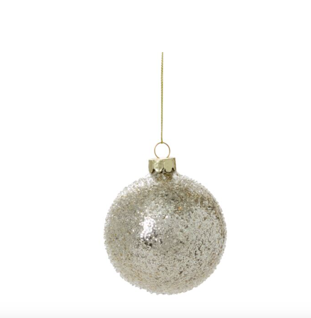 The Isha Ornament Collection sparkles and shines in two versatile sizes. These lightweight glass balls have a textured surface and a pale gold hue that layers with any color story. Style them from top to bottom on a tree or pile them into a decorative vessel as bowl fillers for a festive display.