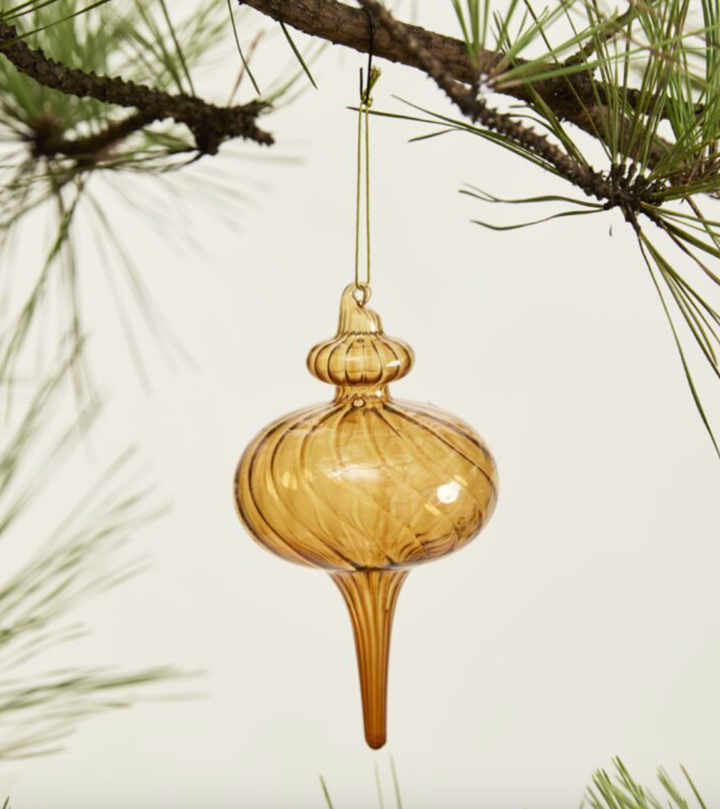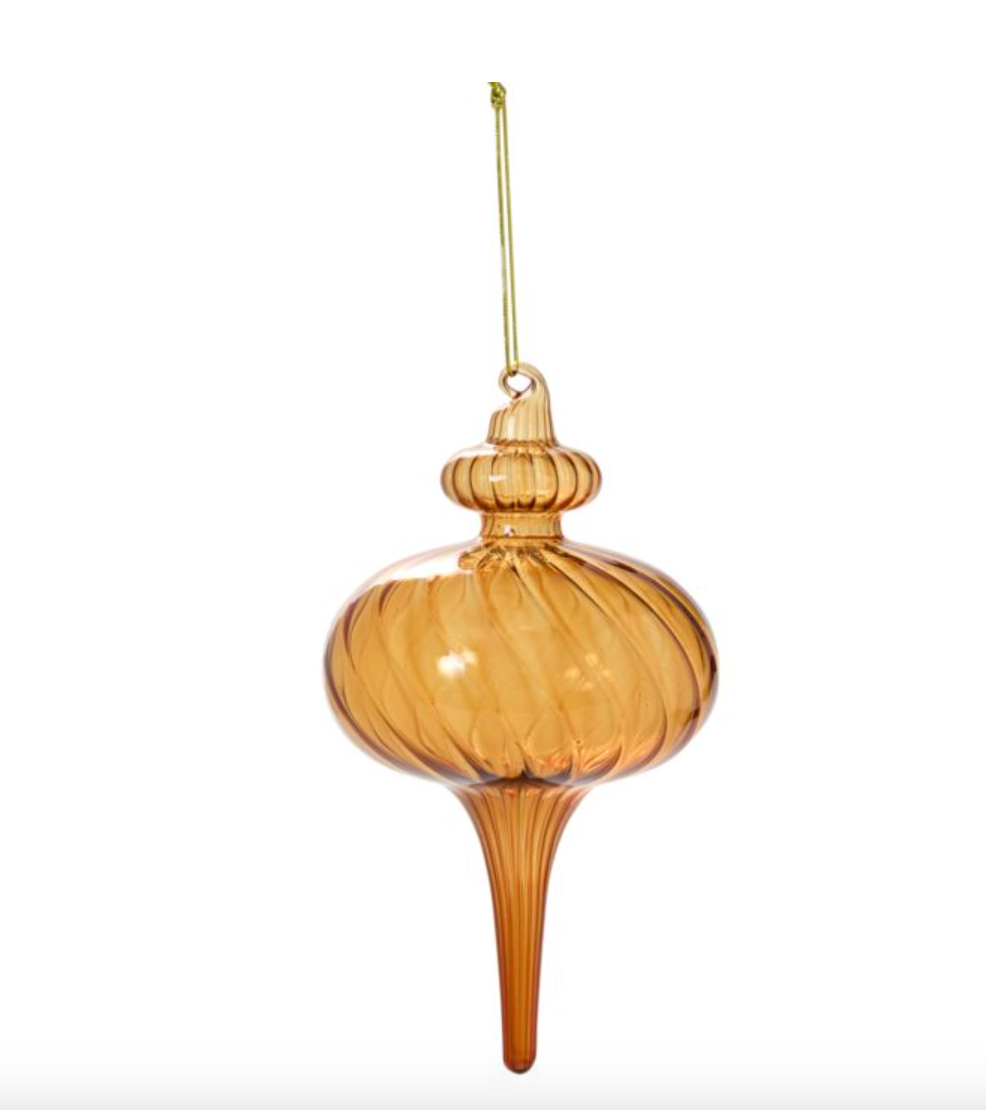 Beautiful blown glass finials make an elegant statement on a holiday tree. The Nicolette Ornament Collection offers two shapes of finials in two warm colorways. Amber and smokey dark brown pair beautifully together for a sophisticated look. These lightweight blown glass ornaments will vary slightly in color from piece to piece as they are hand crafted. Each is topped with a small loop of pulled glass and a gold metallic string for easy hanging.