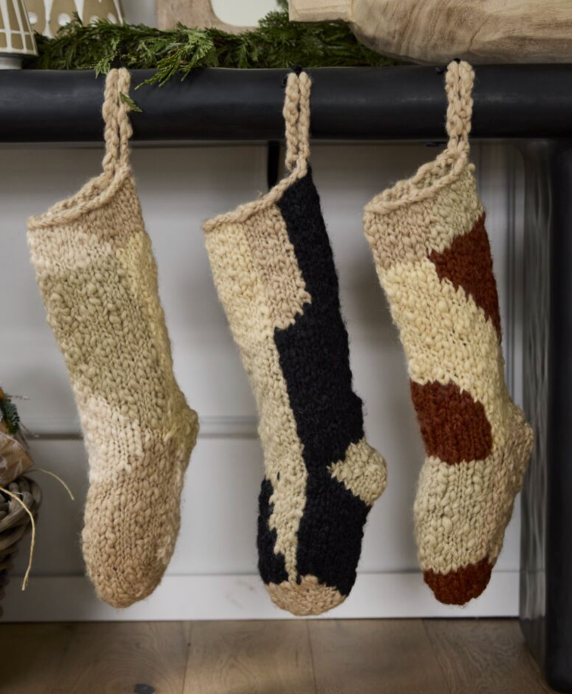 Dress up your mantle with the Quiet Night Stocking Collection. Handmade by artisans in Nepal, these stockings feature an understated color-blocked design on slubby wool yarn.