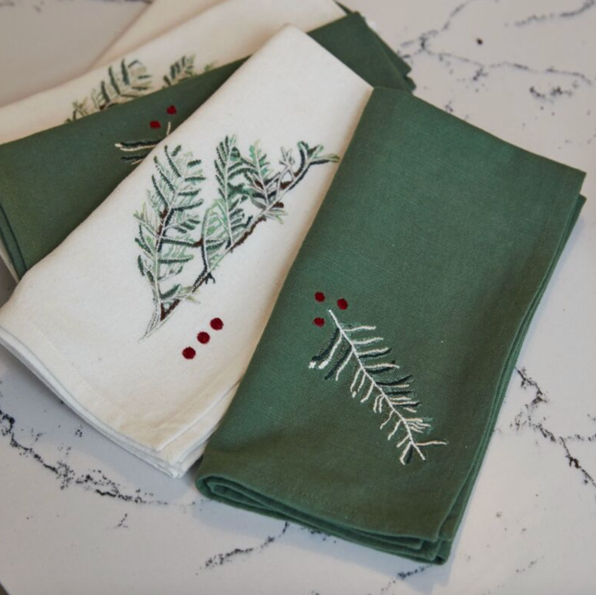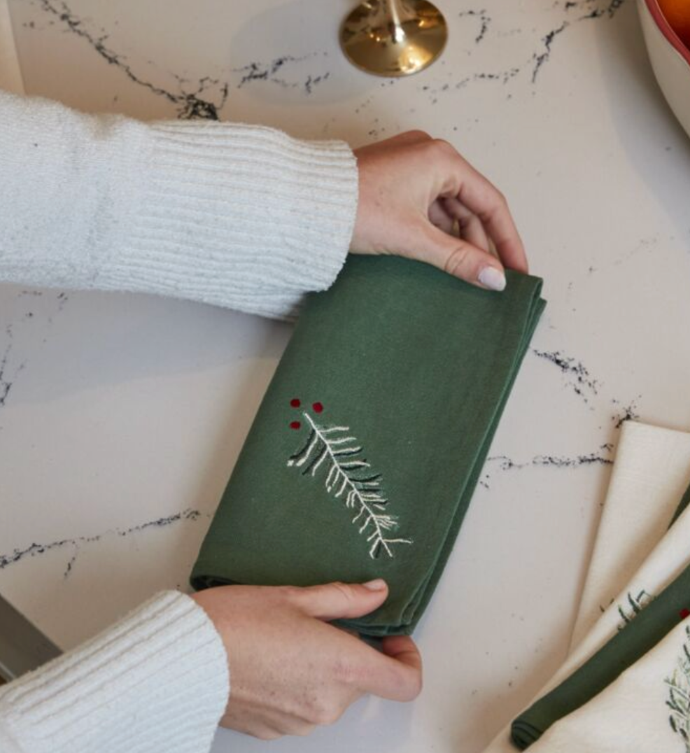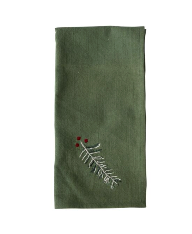 Apres-ski, gather around the table & warm up with a hearty meal. This set of four stunning green linen Alpine Napkins features delicate embroidered greenery & holly berry details & adds a festive, wintry touch to the dinner table during the holidays.