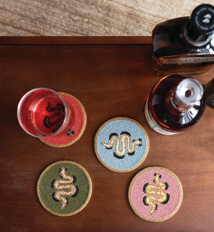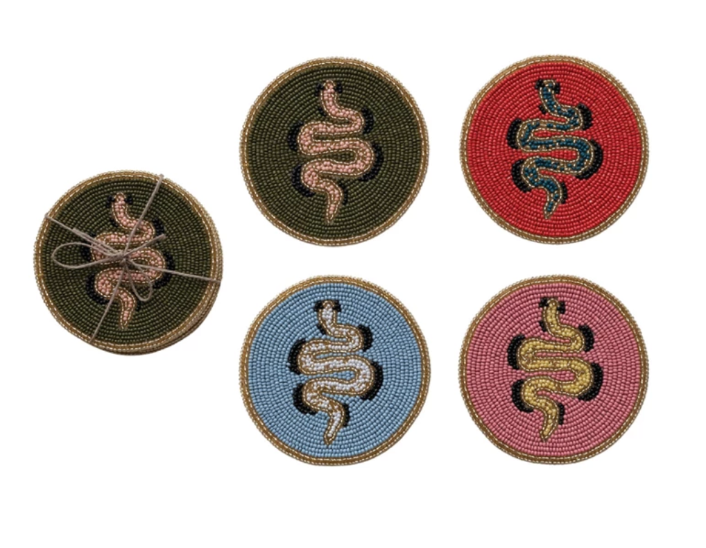 Add a little edge to your tabletop with these funky beaded coasters, each featuring a bold snake motif surrounded by intricate hand-beading. Rich colorways and shimmering texture make them as much art as they are functional.