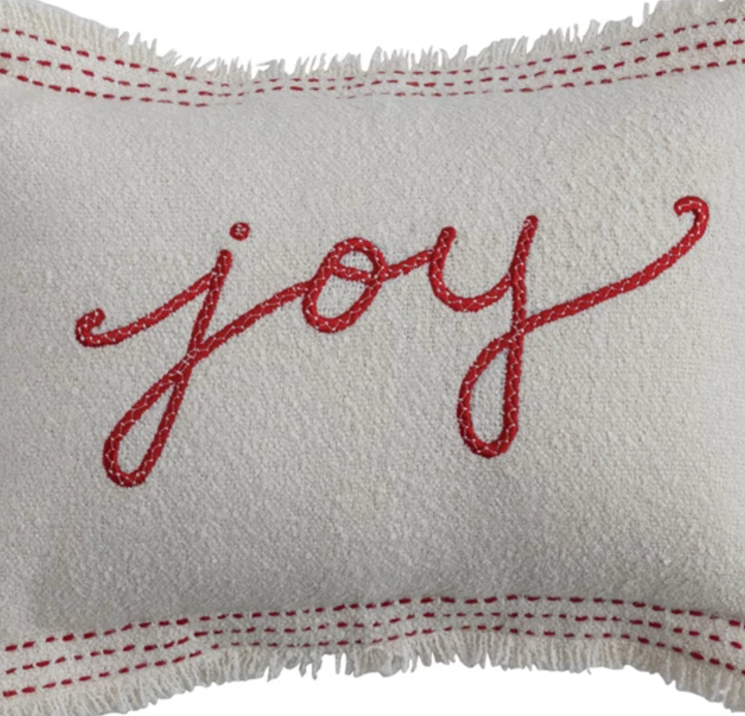 Simple, sweet, and full of cheer — this cozy embroidered pillow brings a touch of ‘joy’ to your holiday décor. The soft textured fabric, red stitched details, and fringed edge make it a charming accent for any festive space.