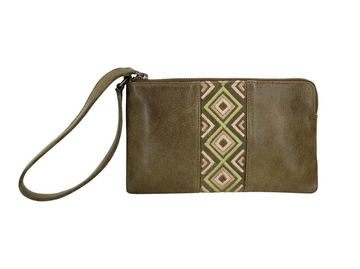 Exterior diamond detailing and a ¾” wide wrist strap zipper pull to open the principal compartment