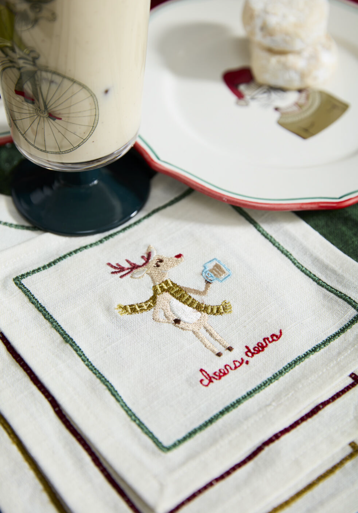 Celebrate the holidays with festive cheer and playful designs from the Tipsy Critter Cocktail Napkin Collection. Each slub cotton napkin features a unique critter in holiday attire, adding a touch of whimsy to your gatherings. Choose from a mallard duck with the punny phrase "ducking holidays," a pink shrimp with "shrimp cocktails," a red-nosed deer with "cheers, deers," or an owl with "the weary world rejoices." Each napkin is bordered with a coordinating chainstitch and pairs perfectly with cocktails, mocktails, and good company.