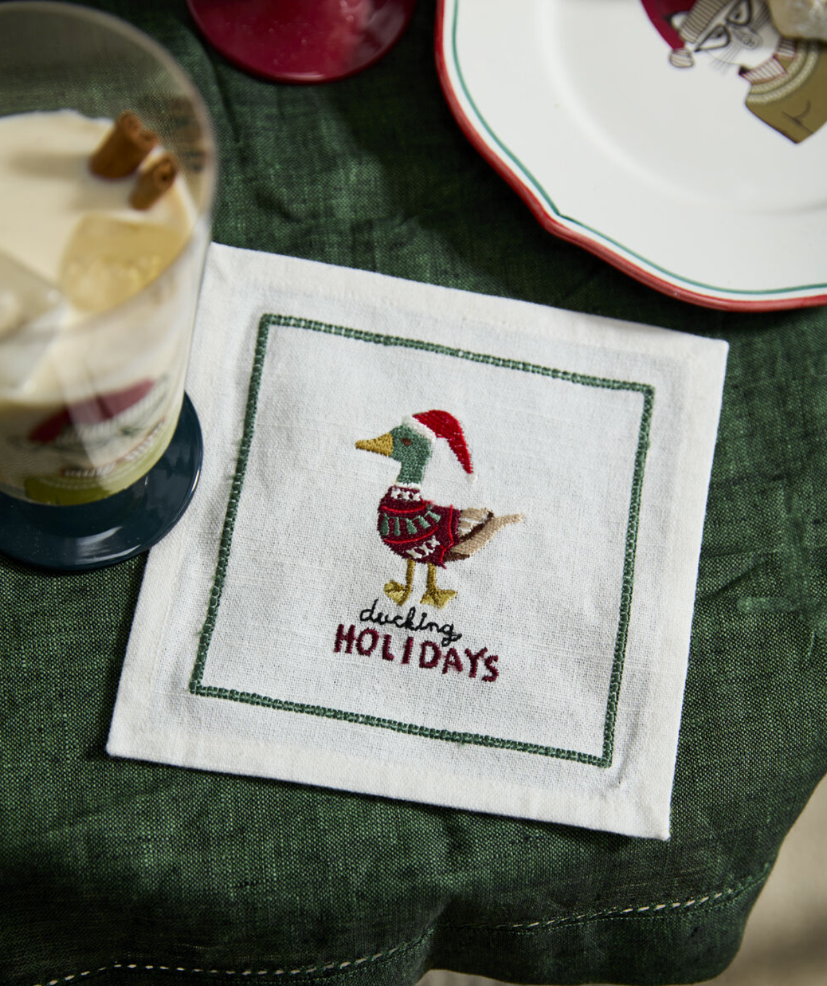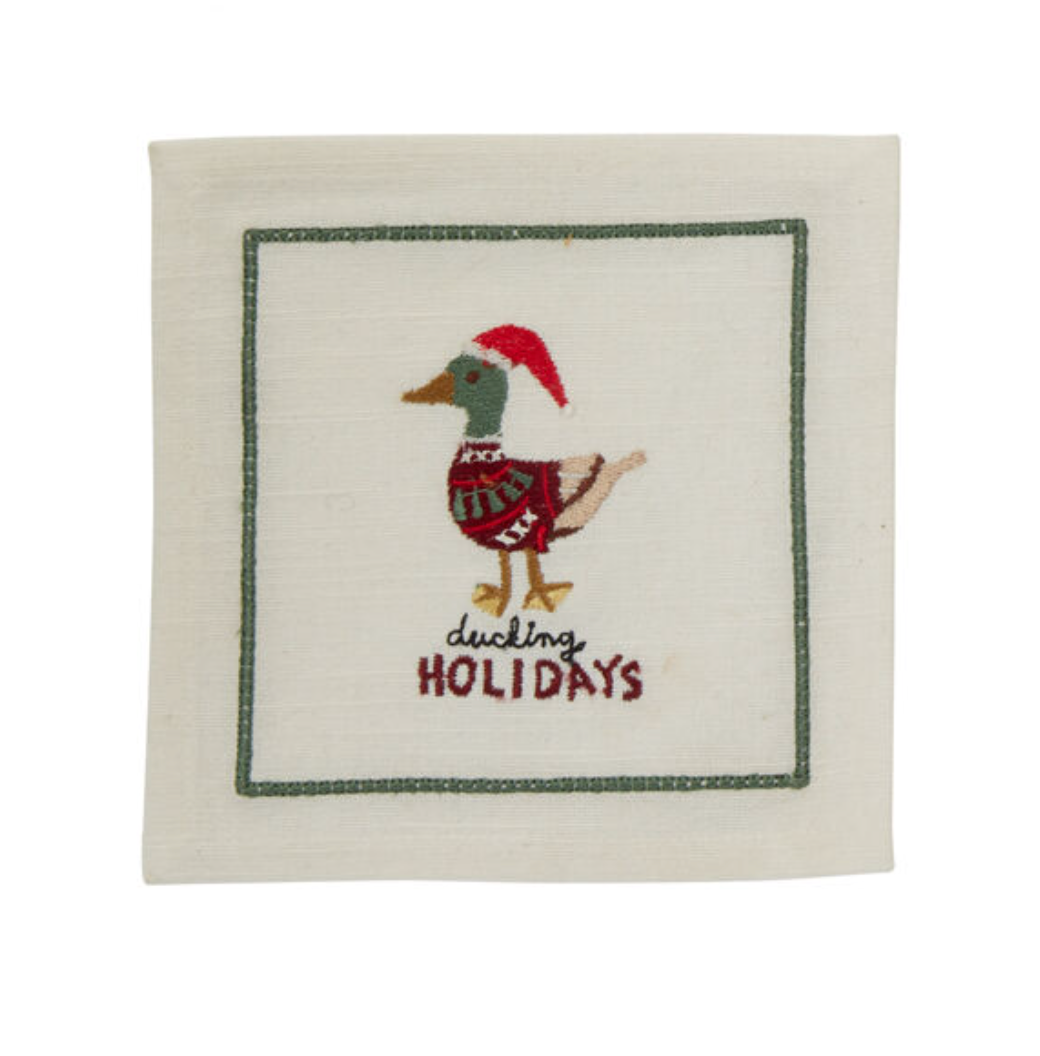 Celebrate the holidays with festive cheer and playful designs from the Tipsy Critter Cocktail Napkin Collection. Each slub cotton napkin features a unique critter in holiday attire, adding a touch of whimsy to your gatherings. Choose from a mallard duck with the punny phrase "ducking holidays," a pink shrimp with "shrimp cocktails," a red-nosed deer with "cheers, deers," or an owl with "the weary world rejoices." Each napkin is bordered with a coordinating chainstitch and pairs perfectly with cocktails, mocktails, and good company.