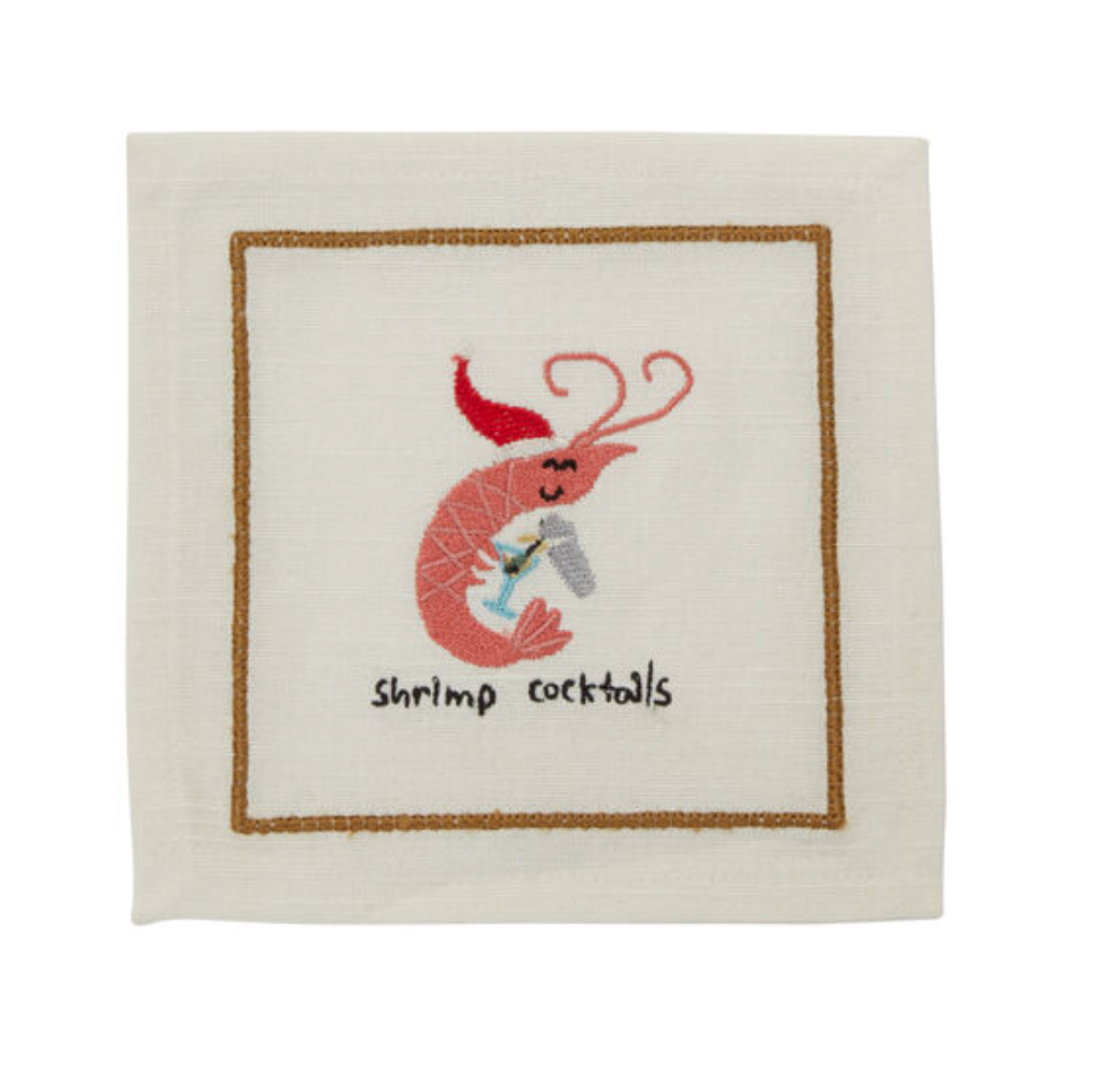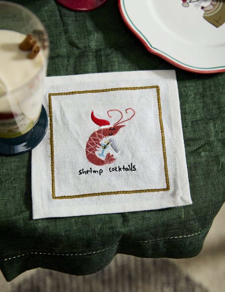 Celebrate the holidays with festive cheer and playful designs from the Tipsy Critter Cocktail Napkin Collection. Each slub cotton napkin features a unique critter in holiday attire, adding a touch of whimsy to your gatherings. Choose from a mallard duck with the punny phrase "ducking holidays," a pink shrimp with "shrimp cocktails," a red-nosed deer with "cheers, deers," or an owl with "the weary world rejoices." Each napkin is bordered with a coordinating chainstitch and pairs perfectly with cocktails, mocktails, and good company.