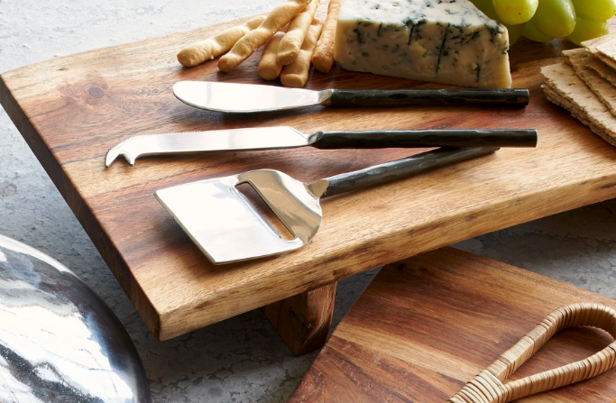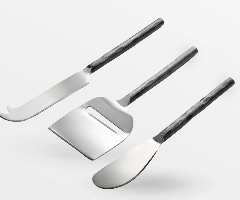 This set of 3 stainless steel cheese knives is hand forged by artisans in India.
